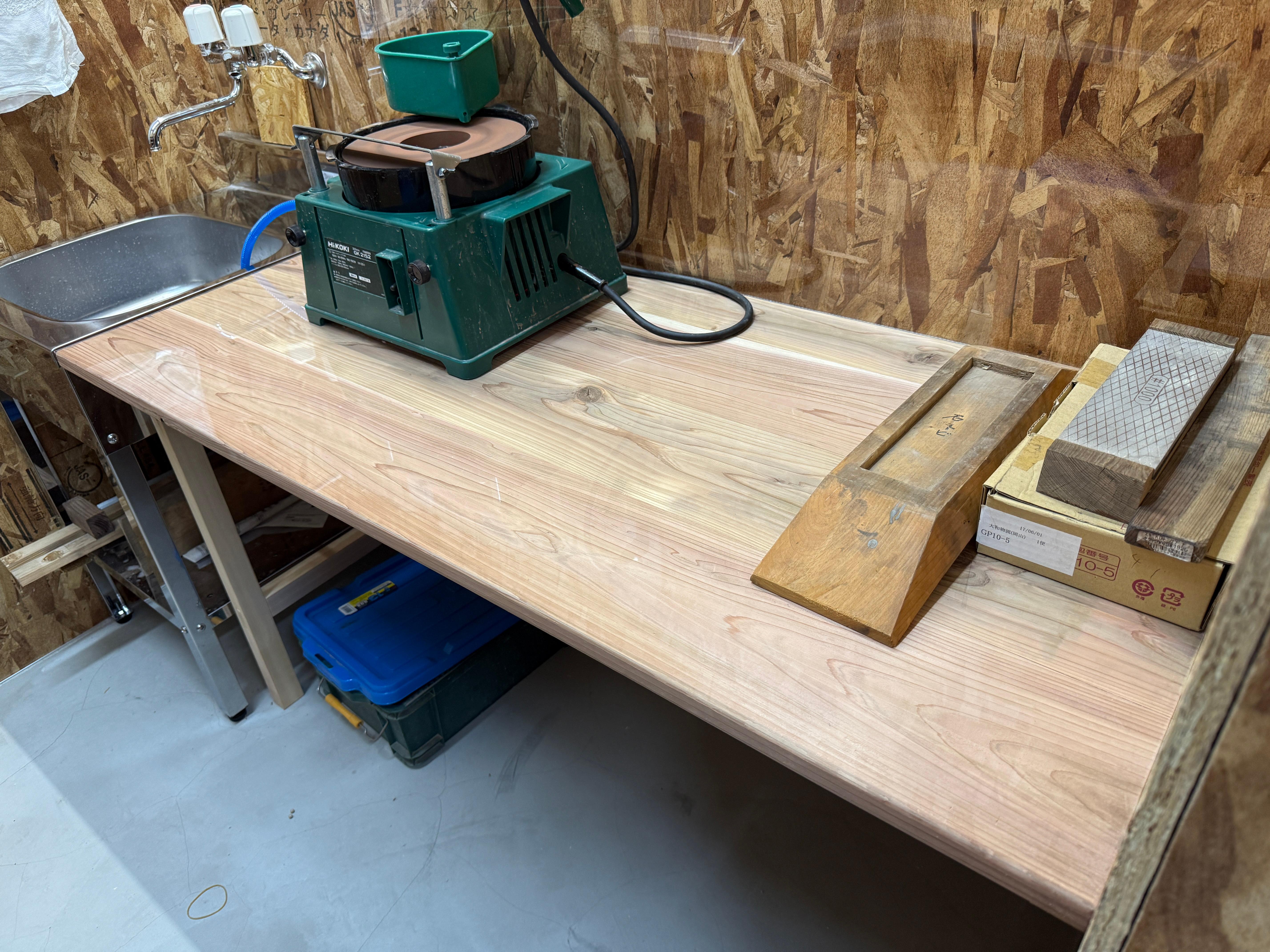 作業場に刃物研ぎのための台を作ったのですが,そのままでは刃物を研いだ汚い水しぶきが台にも壁にもまともに付着するので1mm厚のアクリルでカバーしました.