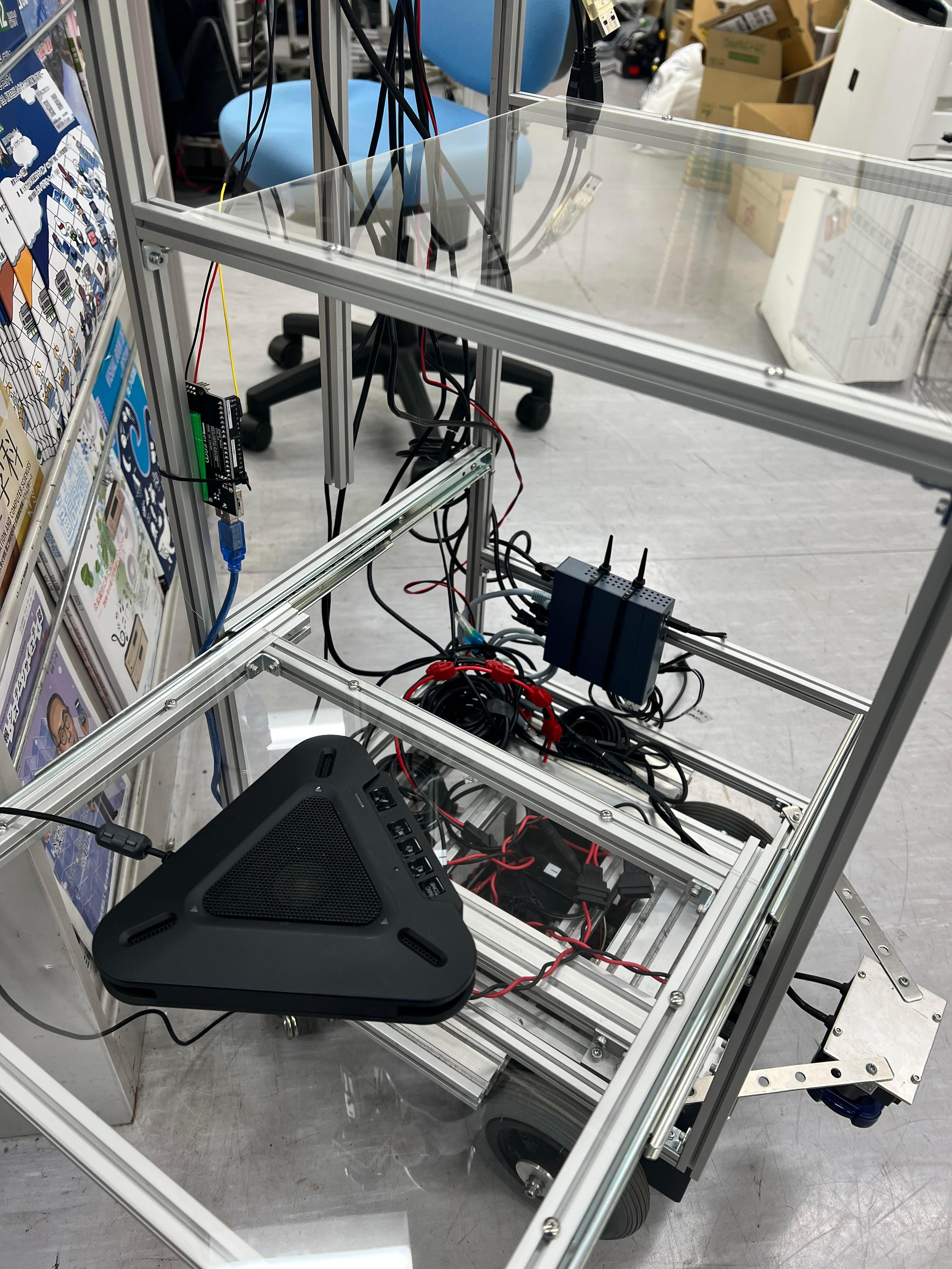 アルミフレームで機器の置台を作成したのですが、その際に棚板としてアクリル板を使わせて頂きました。一瞬、棚板が無いと思うほど透明度が高くてきれいです。