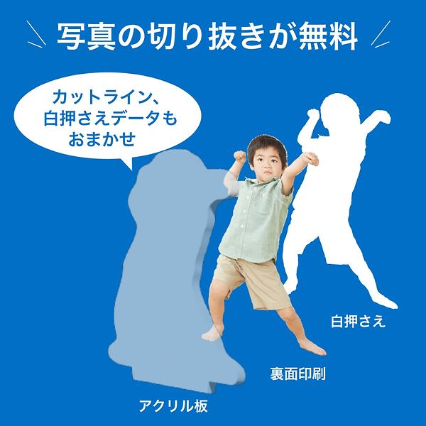 記念品やオリジナルキャラクターグッズなどにも最適です。 - 写真の切り抜き、白押さえ、カットラインはアクリルオンラインのデザイナーにおまかせ。