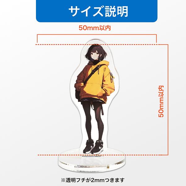 アクリルスタンドの仕上がり寸法は選択したサイズよりも約5mm大きくなります。